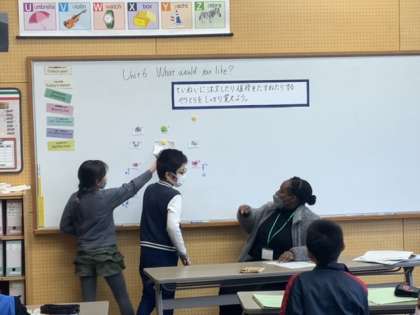 丁寧に注文したり値段を尋ねたりする会話を学習しました。カードを使ってリアルなやり取りとなりました。