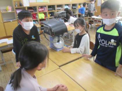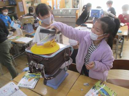 算数科の学習で、はかりを使って身の回りの物の重さを測ってみました。重さを予想してから測るとことで、予想と違っていることに驚いたり、ぴったりになって喜んだりしていました。