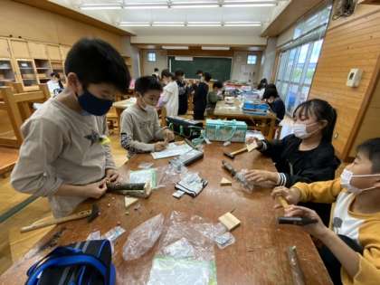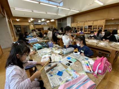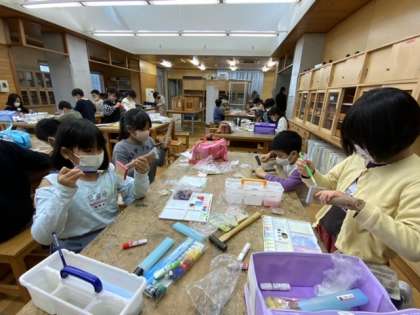 願いに合わせて釘を打ち、水彩絵の具で彩っていきました。可愛い作品ができてきています。