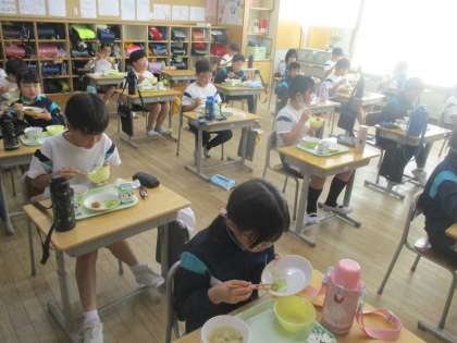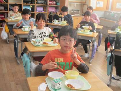 おいしい給食をいただきました。笑顔もいっぱいです。