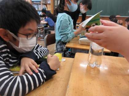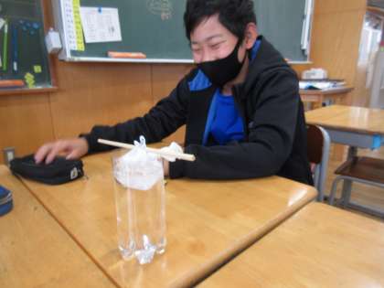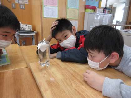 「もやもやとしたものが見えた。」「生き物みたい!」と、食塩がとける様子に興味津々の子供たちでした。