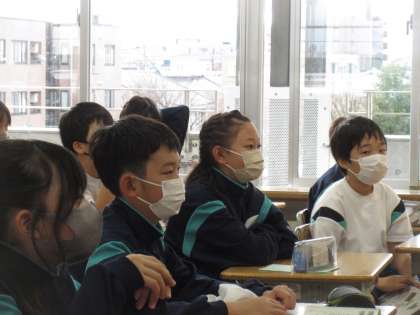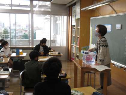 住んでいる地域の水道がストップするという体験をしたS先生が、5年生の子供たちのためにと、その時に配られた水を持ってきてくださいました。体験談を聞く子供たちの目は真剣そのもの。とてもよい時間になりました。