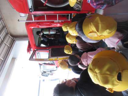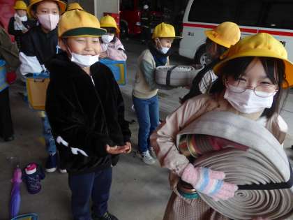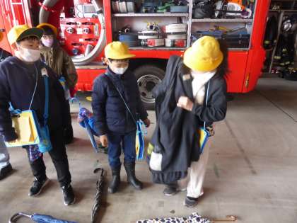 消防士さんの救助に行くときの服や、ホースを持たせていただきました。