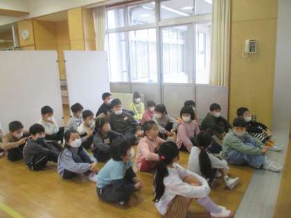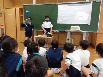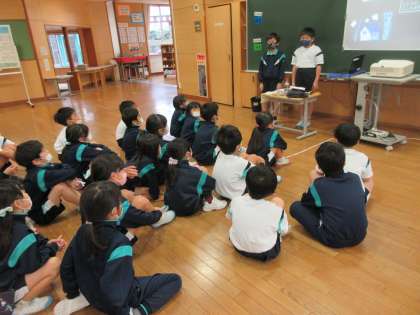 今日は5年生から地震・台風等の災害の危険性や身を守るためにするべきことを教わりました。スライドや紙芝居に分かりやすくまとめてあり、クイズも出題されて2年生はとても楽しく学ぶことができました。
