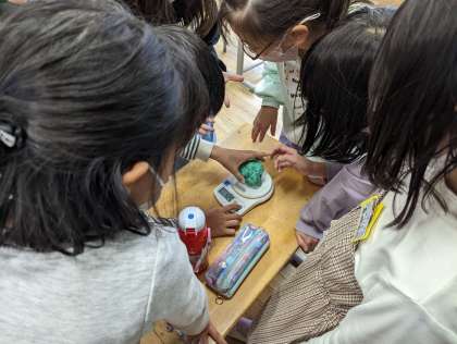 「油ねんどが丸いときと平べったくしたときとでは重さは変わるだろうか」について、予想を話しあった子供たちは、「試してみればいいじゃん!!」と、興味津々な様子。丸い状態で秤に載せると、426g。平べったくし、そうっと載せると、数字が徐々に増え、最後はぴったり426g。