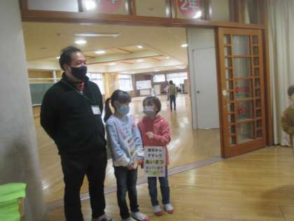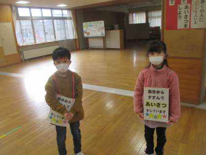 朝のあいさつ、めざせ十人以上を目標に頑張っています。クラスで選ばれた挨拶名人が、玄関付近で挨拶をしています。すてきな挨拶が広まっていっています。