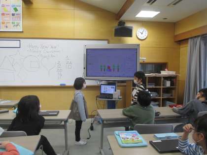 外国語活動の時間に、クロムブックでつくったグリーティングを使ったやりとりをしました。「This is for you.」「Thank you」と英語で言い合いました。