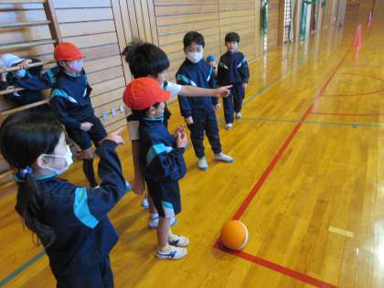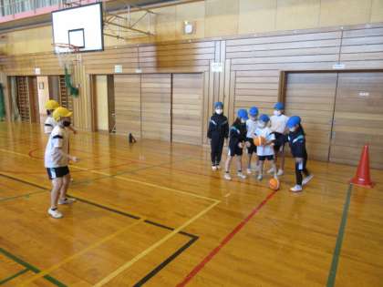 2年生の体育ではキックベースを行っています。試合の際には守る場所を工夫したり、ボールをなるべく相手がいない方向にけったりと、回数を重ねるごとに上達している子供たちです。