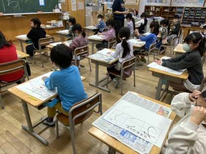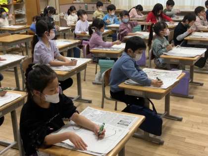 1年生の書初めは、「へいわ」に挑戦します。硬筆ずみを使います。今日は、先生の指示を聞きながら、一緒に進めました。子供たちも、心なしか緊張しています。