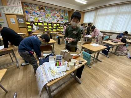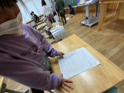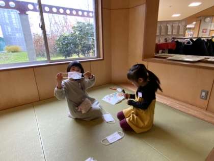 楽しい時間にしようと張り切って活動しています。デンの方では顔を描いたマスクをつけて読み聞かせをしようと準備しています。ものをつくる子、アンケート調査用紙を書く子、それぞれに自分のやりたい思いをもっています。