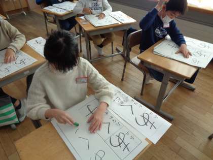 書き初め大会に向けて、練習をしています。1回目よりも濃く、大きく、中心を意識して書いています。これからも頑張りましょう!