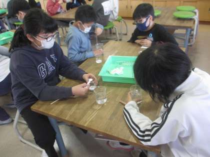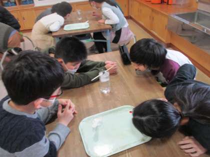 理科「物のとけ方」の実験の様子です!子供たちは、塩が水に溶けていく様子を興味津々に見ていました!