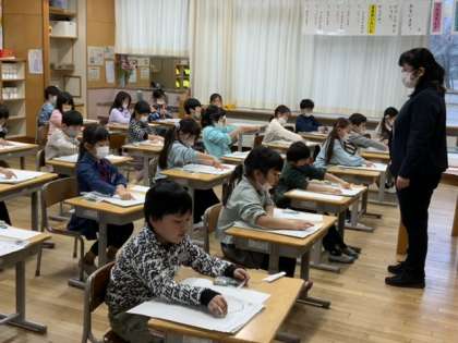 硬筆墨で書初めに挑戦します。紙に書く前に、まず指で書き、イメージしていきました。