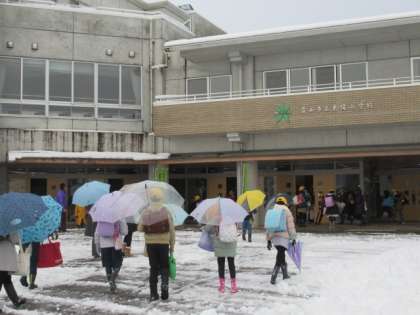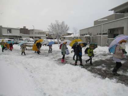 雪道の中、子供たちは元気に登校してきています。大通りの交差点で除雪をしていた職員にも大きな声で挨拶をしていました。