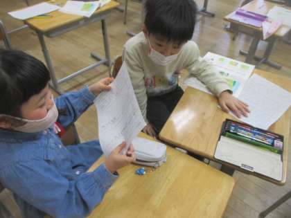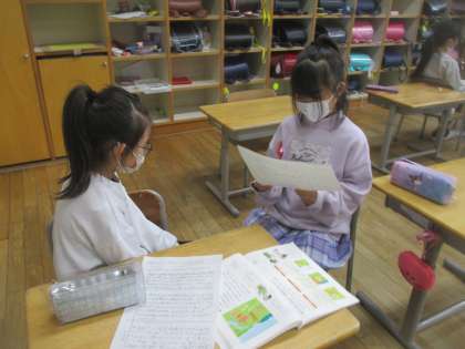 考えたお話をペアの人に聞いてもらい、アドバイスをしてもらっているところです。