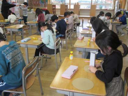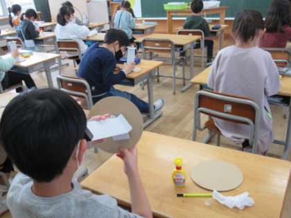 さて、1年生では、「かみざらコロコロ」に挑戦です。これは、三角支柱をまずつくります。失敗しないよう、先生のお話をしっかりと聞きながら、製作を進めています。