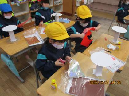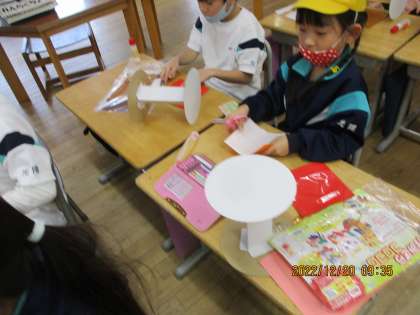 図画工作科では、キットをつかって「かみざらコロコロ」の学習をしています。丸い台紙を上手に組み合わせてコロコロ転がるおもちゃの完成です。