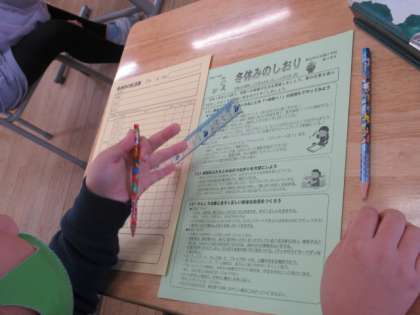 冬休みのしおりを用いて、生活のルール等について学級指導をしました。安全で楽しいお休みにしましょうね。