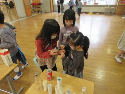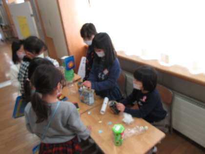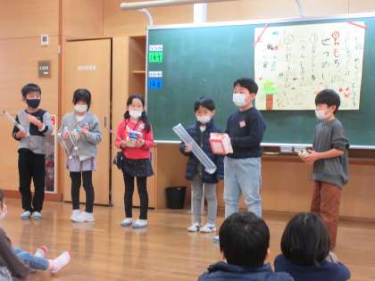 今日は生活科で作ったじぶんたちの「うごくおもちゃ」で1年生と交流会をしました。1年生のことを考えながら場所を準備したり、プレゼントを用意したりしました。相手のことを考えて、みんなで協力して、1年生に喜んでもらい、とてもいい時間を過ごせました。