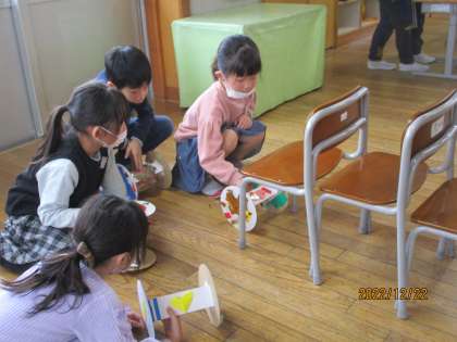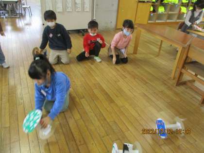 完成したおもちゃを使ってみんなで遊びました。椅子のあしにくぐらせたり、友達と競争したりしました。