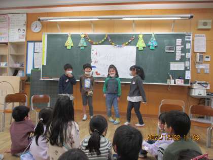 今日は2学期最後のお楽しみ会を各クラスで行いました。どのクラスでも、係の子供たちがそれぞれ考えた企画で大盛り上がりしました。