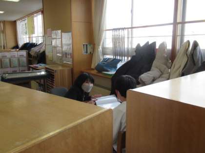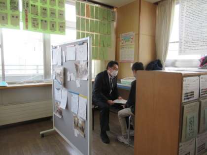 終業式が終わったら、いよいよ「あゆみ」をもらう時間です。みんなとは少し離れたところに場所を設け、一人ずつ個別に行います。担任の先生が、この2学期に頑張っていたこと、そして成長したなと感じたこと、さらによくなるための課題等を伝えながら、あゆみを渡していきました。