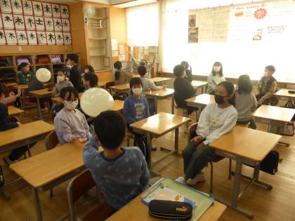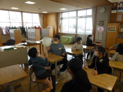 席替えをした後、新しい班の仲間と風船バレーをして楽しみました。
