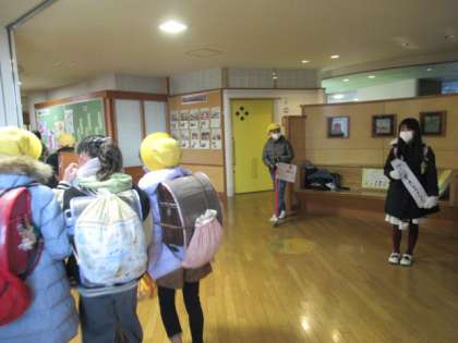啓発のための旗を持ちながら、登校してくる子供たちに声を掛けてくれている子供たちの姿があります。