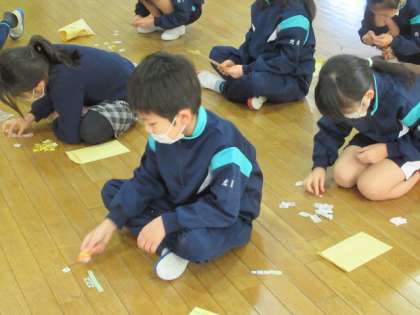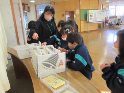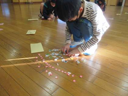 PTAの方々が多目的教室に設置してくださったベルマークのコーナーに、1枚1枚整理して提出しました。