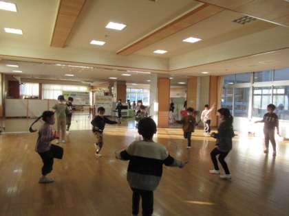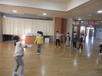登校した子供たちは、さっそく思い思いに活動を始めています。1階多目的教室では、自主的に縄跳びに励む子供たちの姿があります。