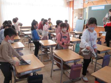 紙てっぽうを使って、投げる運動の基本を学びます。遊びを含めながら技能を高めることができるため、子供たちは競い合って取り組んでいました。