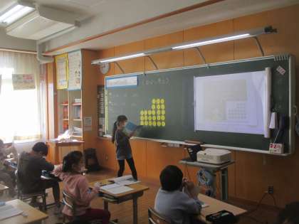 かけ算を使って、チョコレートの数を求めます。数の求め方を図や言葉で説明しています。「そんな求め方もあるのか」と友達の話を真剣に聴く子供たちです。また、聴いた話をノートにメモする子供もいました。クラスのみんなで学び合っています。