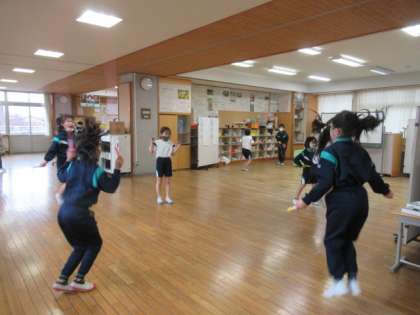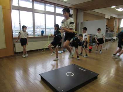 2限後のさんさんタイムには、縄跳びに励む子供がたくさんいます。ジャンピングボードを活用して二重跳びの練習をする子供もいます。