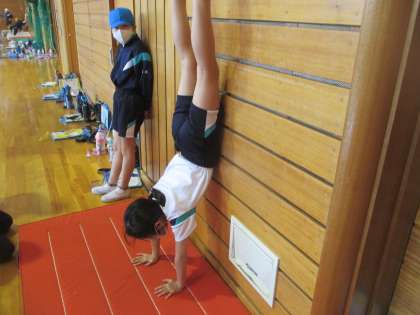 体育科の授業で、マット運動を学習しました。子供達は壁倒立など苦戦しながらも一生懸命取り組んでいました。