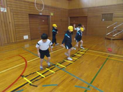 外が寒くなっていますが、いろいろな運動をして、子供たちはぽっかぽかです。今日の体育では、ゴム跳びとラダーを使った運動をしました。