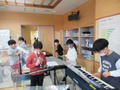 クラスを4つのグループに分けてアンサンブルに挑戦しています。使う楽器は、鍵盤ハーモニカ、リコーダー、ビブラフォン、シロフォン、バスキーボードです。