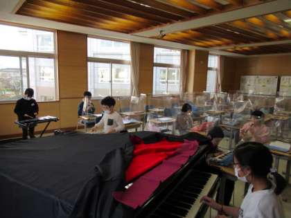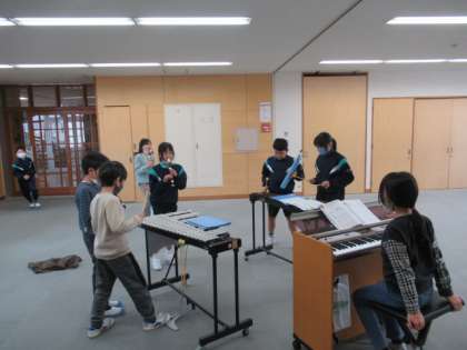 「茶色の小びん」のグループアンサンブルに取り組んでいます。1グループは、6〜8名、そのため一人一役となる楽器も多いです。まずは教え合って、自分の役割をできるようにしました。