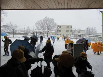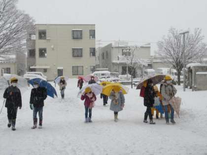 子供たちが登校してくる前にということで、朝7時より職員総出で除雪作業を行いました。敷地はもちろん、歩道の確保や交差点で待つスペースの確保等、子供たちが少しでも安全に登校してくることができるよう、職員もがんばっています。大通りの交差点については、かなりの人数の職員を投入して必死に作業。子供たちが通過する前になんとか対応を終えました。