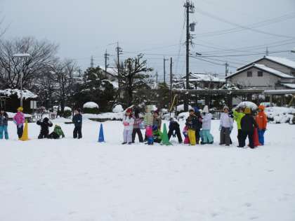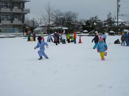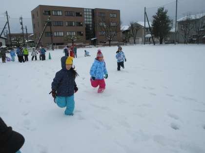 今日の体育はグラウンドに出て、雪上で行いました。雪の上を走ったり、雪玉を作って投げたりしてトレーニングしました。子供たちは雪の上で躍動していました。