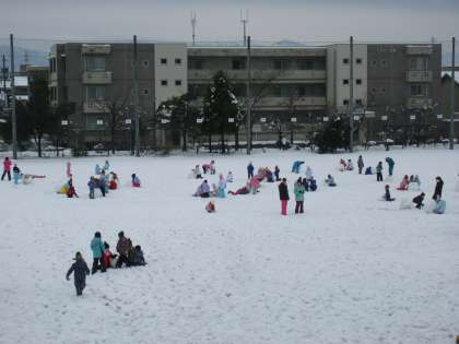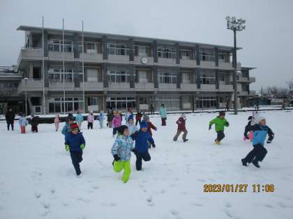 雪がたくさん積もったので、楽しみにしていた雪遊びを行いました。ワクワクした表情の子供たち。早速雪の上を走ってみました。「走りにくいけど、楽しい〜!」と喜んでいました。