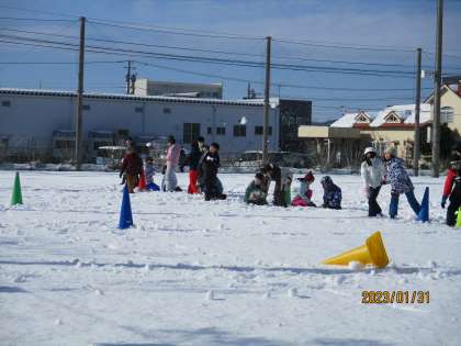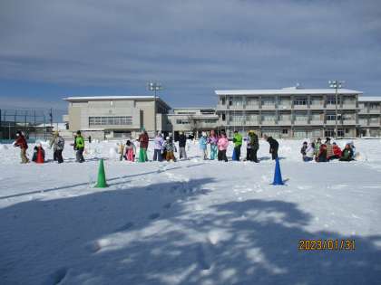 自分の団のカラーコーンを、決められた位置から雪玉を投げて倒すというゲームです。