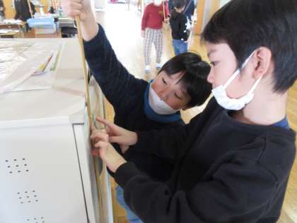 長いものを調べるときは友達のものさしとつないで、つないで・・・。協力して調べる姿があちらでもこちらでも見られました。