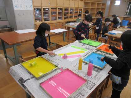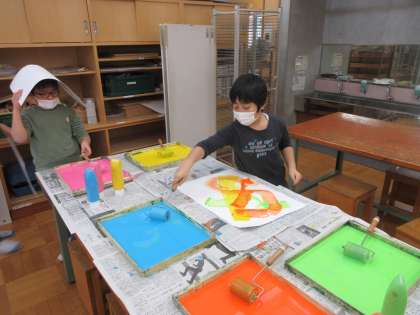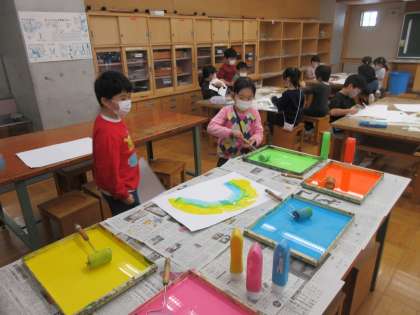 2年生の図画工作科では、「海の中をのぞいてみると」というテーマで作品をつくっています。今日はローラーを使って画用紙にカラフルな色を塗りました。この後、シールを貼って、さらに濃い色を塗ってからシールをはずすと・・・楽しみな作品に仕上がりそうです。