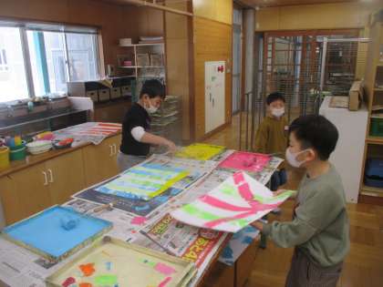 ローラー版画で作品を製作中です。色の組み合わせや、ローラーで色を付ける感触を楽しんでいました。