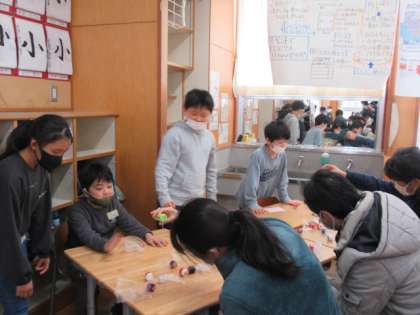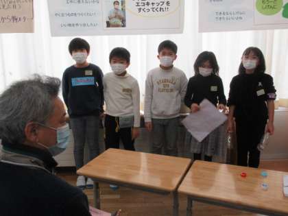 ペットボトルキャップを使ってものづくりをしてきたことを、それぞれのチームがお店をつくって発表しました。今日は、全校に発表する前に、保護者の方をお客さんとして発表の練習をしました。