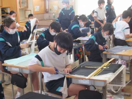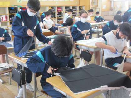 布にしるしを付け、裁った後、折り目を付けていきます。ミシンで一気に縫い上げるための準備活動を子供たちは意欲的に進めています。