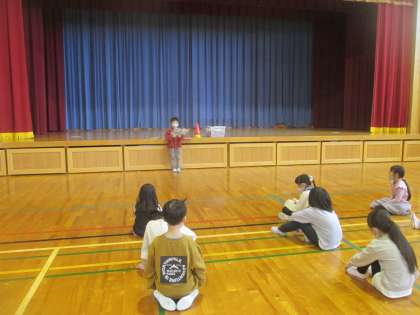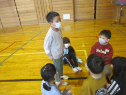 国語の時間に本で調べた「みんなで楽しめる遊び」で遊んでみました。遊び方を説明してもらい、その説明に従って遊んでみます。初めて遊ぶ遊びがたくさんあり、楽しんで活動していました。