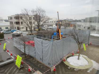 防災井戸設置場所の現場にはシートがはられました。間もなく地面を掘り深める作業が始まる模様です。