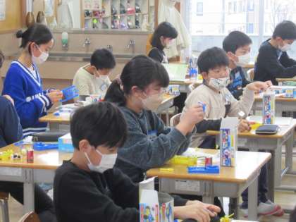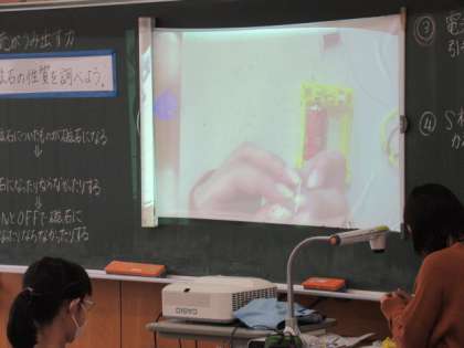 一人一人が実験キットを持ち、調べていきました。前には、教師が実際にやってみているところを投影しているため、分かりやすいです。