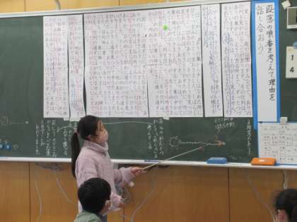 黒板いっぱいに叙述が並んでいます。それぞれの段落を、内容・全体の構成を考えて並べてみています。さて、なぜこのようになるのか、話し合いました。ダイナミックな展開に、子供たちも積極的に発言しています。